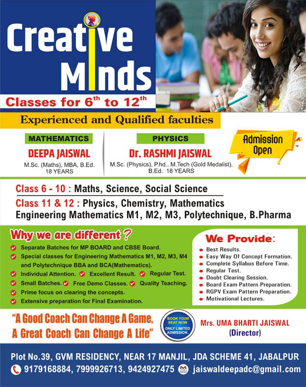 Plot No. 39, GVM Residency, JDA Scheme No. 41, Next to Hotel Prince Viraj, Vijaynagr, Jabalpur M.P. |