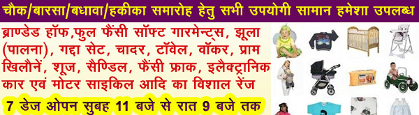 Infant Accessories: Baby Cotton nappies (square, triangle & string), Disposal Diapers (pampers), Lockable Nappy Pins, Nappy Wash liquid, pull-on" Plastic panties Trainer pants (padded pants), Tie- Pants-Snips, Plastic Diapers (with Velcro, Buttons, Inside-Towel outside Cotton), Ever Dry Nappies, Nappy Liner (Washable / Disposable), Bonnet caps or Fancy Caps, Woolen Caps and Socks, Booties, Shoes, Fancy Socks, Extra Soft Mittens, Bibs and Aprons ( Extra Absorbent), Dikky-Bibs, Extra Soft Towels (with hoods / without hoods and in photo prints), Extra Soft Face Napkins, Bath Sponge, Plastic Mats (with / without foam), Plastic Massage Mats. Wrappers (Cotton & fancy quilted), Carry-Nest, Carry Cots, Carrier (Slings), Cot-sets (with pillows and side pillows), Head Pillow, Folding Mosquito Net, Nappy Holders ,Travelling Bags and kit Bags Traditional "Khoyas"