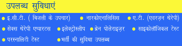 Available Facilities : ECT , Narcoanalysis, AT (Aversion Therapy ), Sex Therapy Apparatus, Electrosleep, Brain Polariser, Psychological Tests, IQ Test, Personality Test Etc.