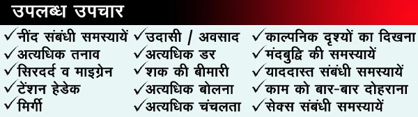 Available Treatment For : Insomnia, Anxiety, Migraine, Tension Headache, Epilepsy, Depression, Phobia, Schizophrenia, Bipolar Disorder / Mania, OCD, ADHD, Dementia and Sex related Problems.