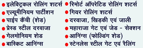 Manufacturer and Suppliersof - Pull and Push Type Rolling Shutters, Gear Type Rolling Shutters, Electrically and Remote Operated Rolling Shutters, Steel Gate, Door, Window, Maharaj Gate, Pressed Steel Door, Stainless Steel Gate and Railings, Basket Awnings and Folding Sheds etc.