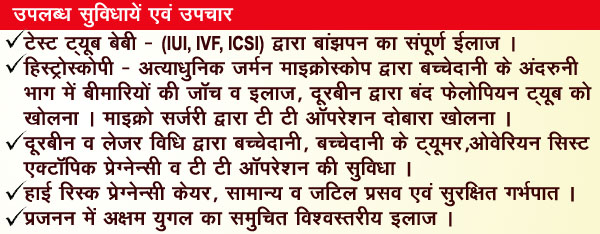 Superovulation with IUI, IVF, Surrogacy, Sperm Bank, ICSI, Oocyte and Embryo Donation Adoption, Sperm Retrieval Techniques, USG/3D Colour Doppler, TESA, MESA, PESA, TESE, Video Endoscopy, Semen Laboratory, Hystero Laparoscopy, Embryo Reduction, Advanced Laparoscopic Surgery, Genetic Counselling, High Risk Pregnancy, Embryo Freezing and Helpline and Counselling.