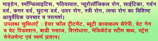 Special Ayurvedic Treatment for :Migraine, Spondylosis, Sciatica, Neurological disorders, Arthritis, Neck Pain, Knee Pain, Piles, Gastric Disease, Gynec problems and Skin Diseases.