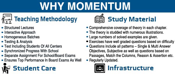 About, Momentum Academy:The MOMENTUM ACADEMY was started 16 years back in 2003 when five young, dynamic and enthusiastic educationists decided to enlighten the young kids of Mahakoshal (Jabalpur). The institute helps prepare a student for top level engineering and medical entrance exams as well as other exams like NTSE, Olympiads and KVPY. Year long courses are available for students from class 9th to 12th and droppers. VISION - To be a place where best opportunities are made available to student to learn, perform and achieve the highest.