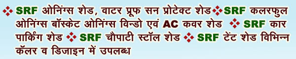We are suppliers of SRF Awnings including Window Awnings, Balcony Awnings, Car Parking Awnings, Fixed Awnings, Residential Awnings, Commercial Awnings, Bull Nose Awnings, Door Awnings, House Awnings, Roof Awnings, Awnings, Awnings Canopies, Tensile Structure, Car Parking Structure, Roofing Skylight Structure, Poly carbonate Structures, Walkway Structure, Prefabricated Structure, Hanger Structures, Cladding Structures, Tents, Garden Umbrellas and Entrance Glass Canopies etc.