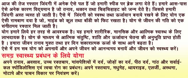 Benefits : Yoga for Holistic-Health Management, Manage Your Stress, Depression, Hypertantion, Muscular Pain, Joint Pain, Back Pain, Lumber and Cervical Spondylosis and Skin Disease.